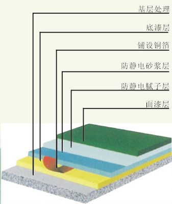 | 面漆層 | 用防靜電自流平鏝刮一遍,用消泡滾筒消泡 | 防靜電自流平 | — | 0.8~0.10kg/m2 |